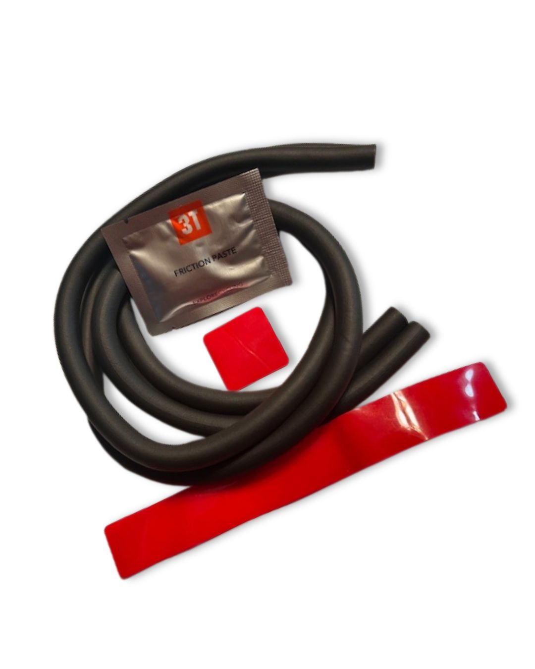 Included are front and rear thru axles, a 3T Ultra integrated headset, a 3T Ritchey alloy saddle clamp set, a 3T fork expander kit, vibration-dampening foam sleeves, 3T friction paste, and frame protection decals/patches — everything shown in the photos.