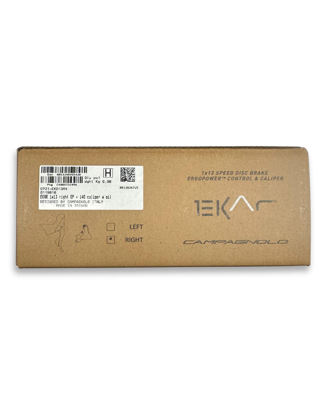 This is a genuine Campagnolo Ekar Ergopower hydraulic brake + shift lever assembly (right / rear), model EP21-EKD13R4. The system is built for Campagnolo’s 1×13-speed Ekar drivetrain. You get the lever unit, built-in caliper (flat-mount, 140 mm rotor interface), filled brake hose, and included hardware.